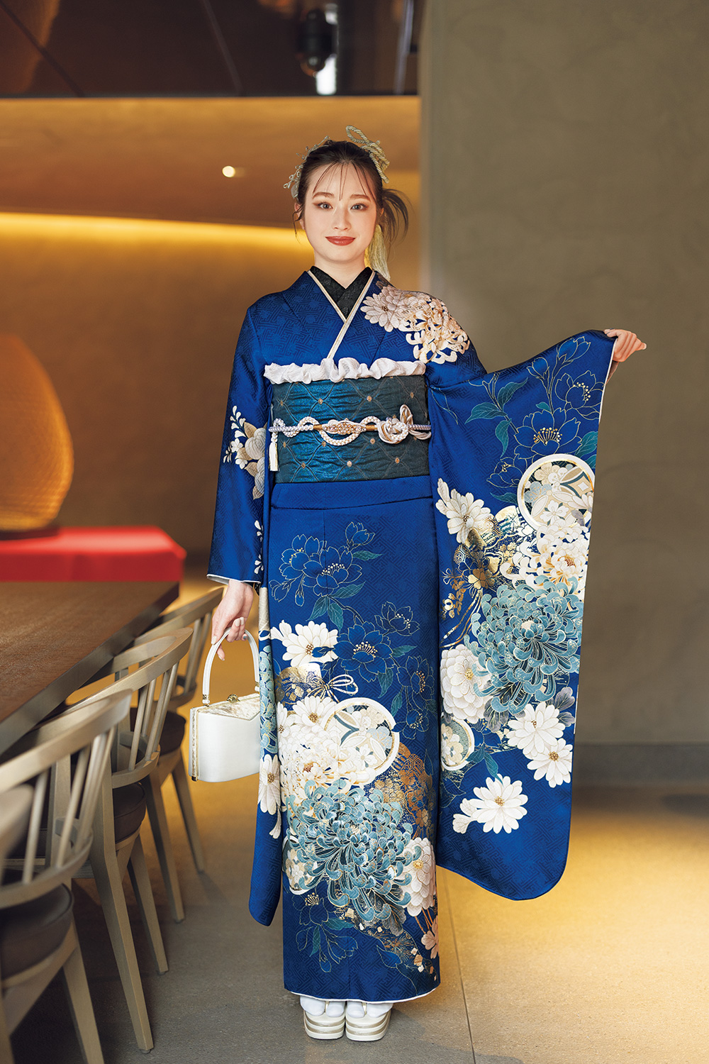 あか抜けた鮮やかなブルーと響き合う菊は、二十歳の主張そのもの。陰影を利かせた身頃を愛らしい丸紋が彩り、花づくしでとびきりの幸福を呼び込みます。