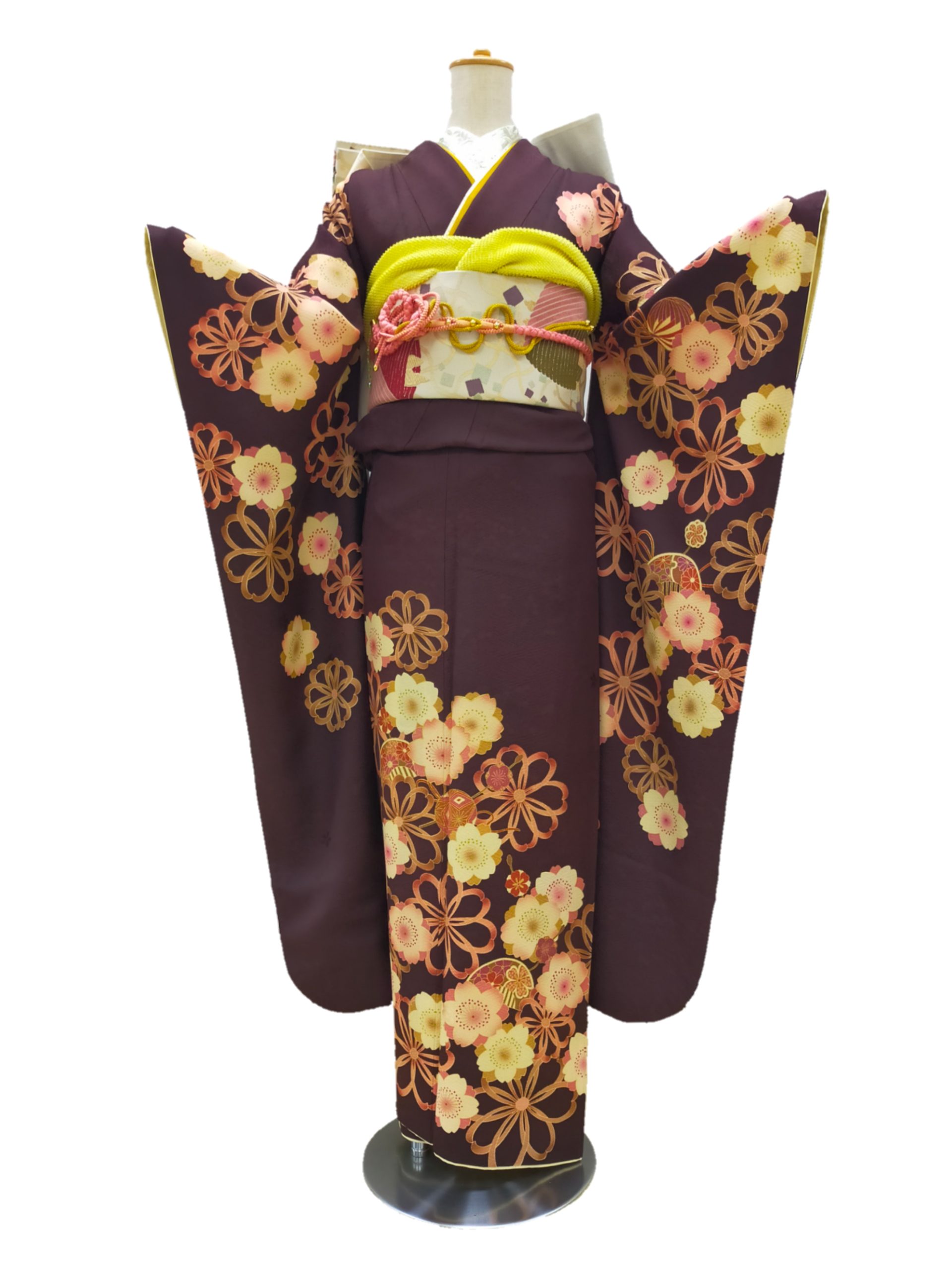 No.48 ピンクの桜が可愛らしい茶色地振袖