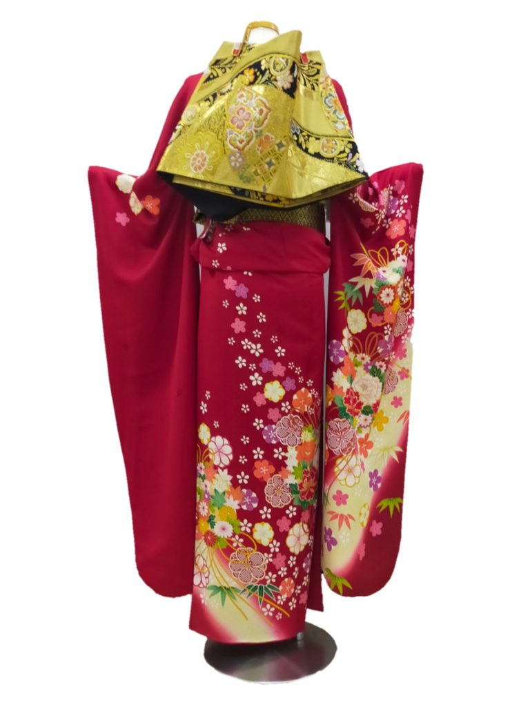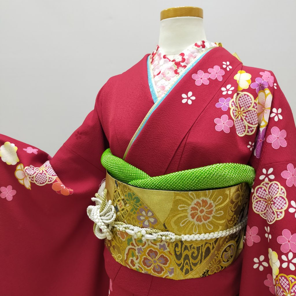 赤振袖に金色の帯は人気の組み合わせです♪