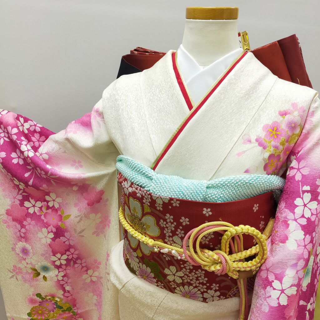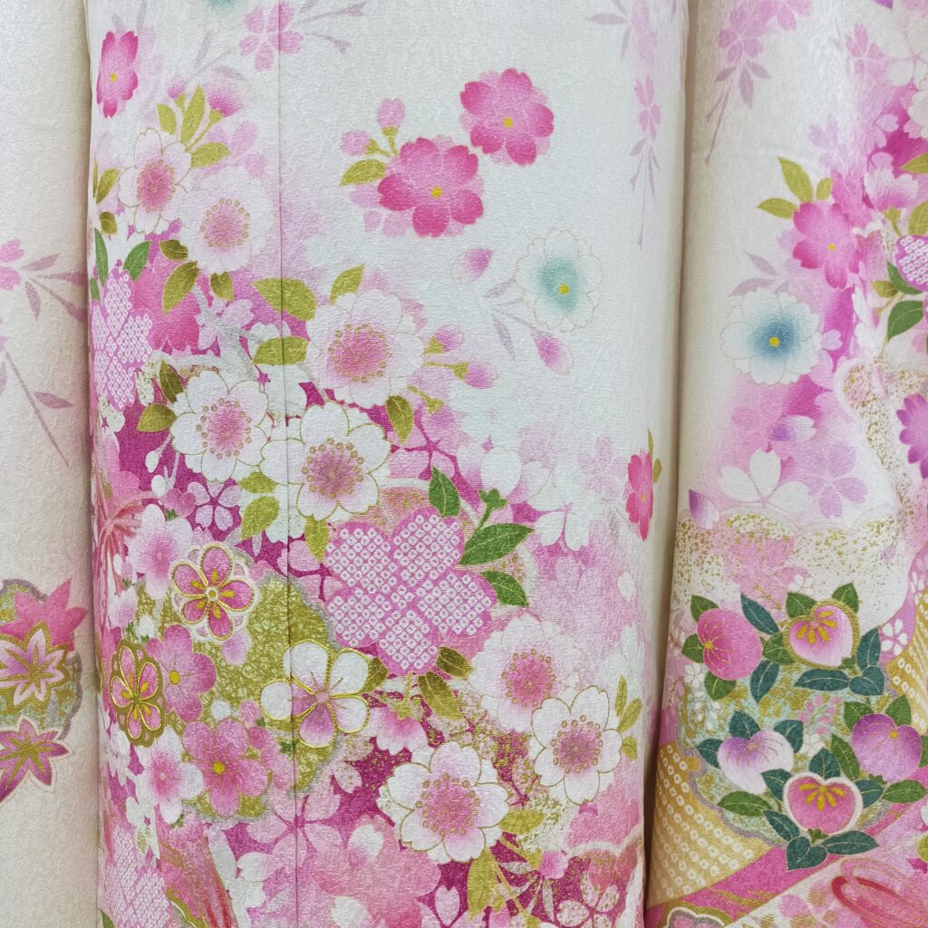 白地にピンクの桜が咲きほこる可愛らしい振袖です。