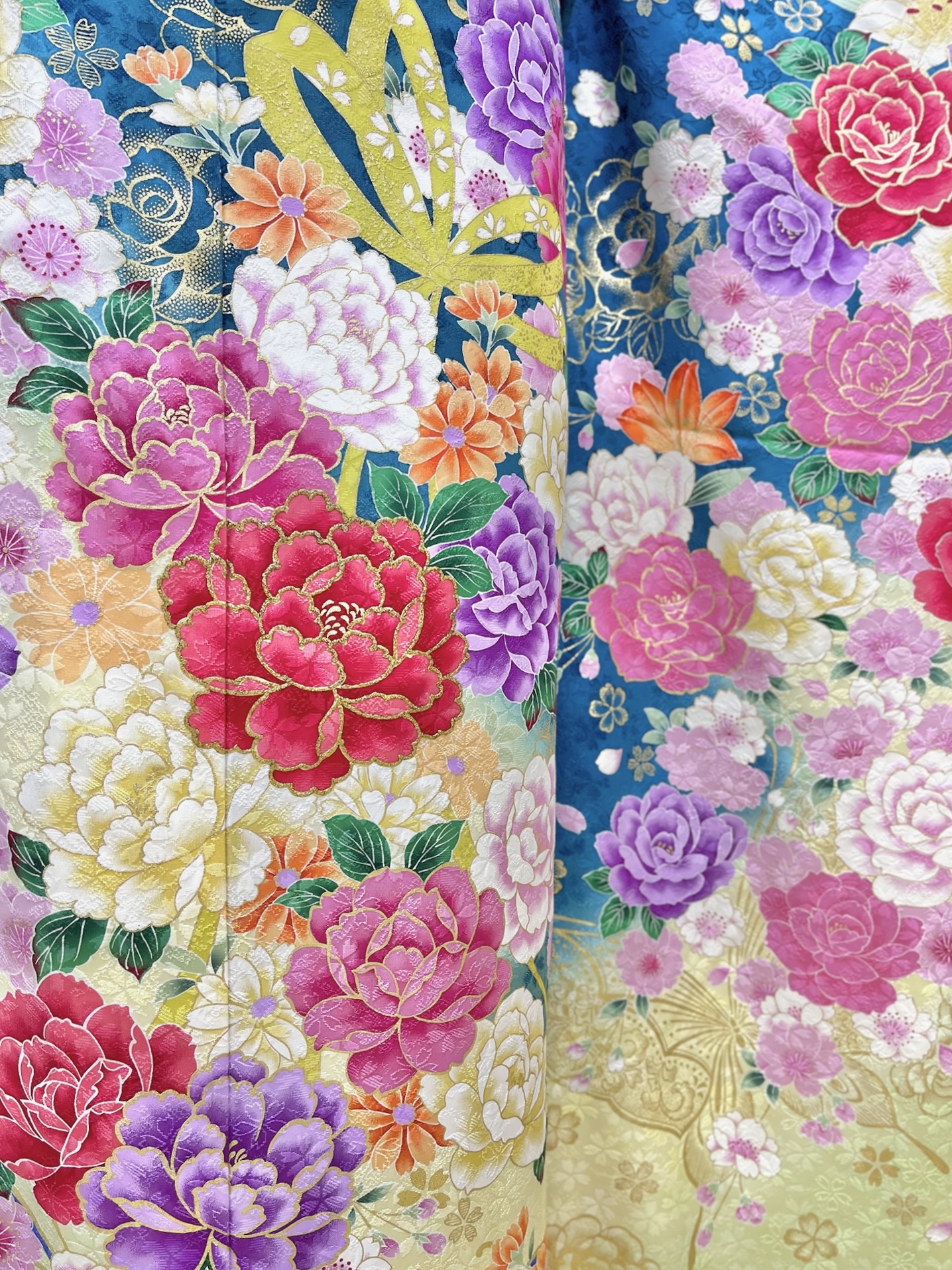 鮮やかなターコイズブルーから裾にかけて柔らかなクリームイエローへのグラデーションが美しい一枚。薔薇をはじめ花々が華やかに咲き誇り、ゴージャスで写真映えするデザインです。花々の色彩も豊かで、可憐さと豪華さを兼ね備えています。