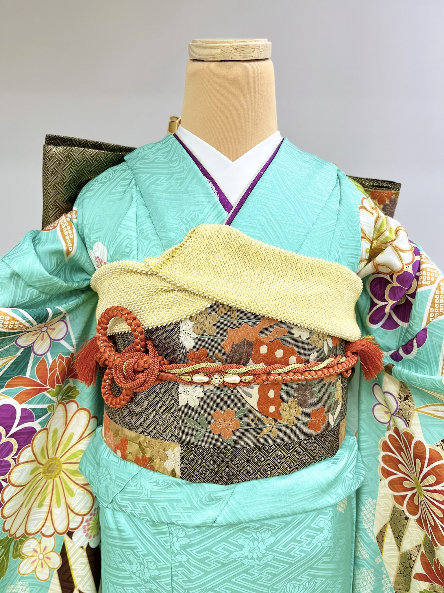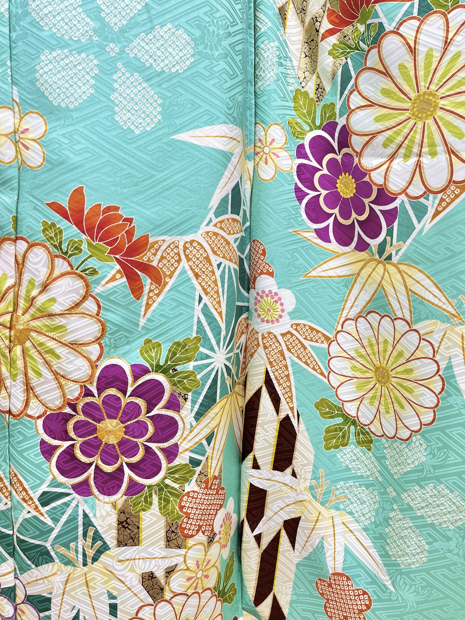 明るく澄んだミントグリーン地に、菊や笹、麻の葉などの吉祥文様が描かれた一枚。