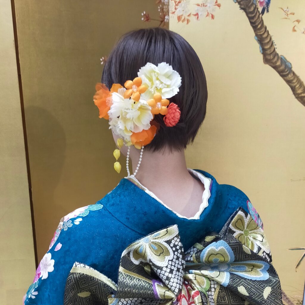 ▲青振袖の反対色であるオレンジ色の髪飾りがポイントです。