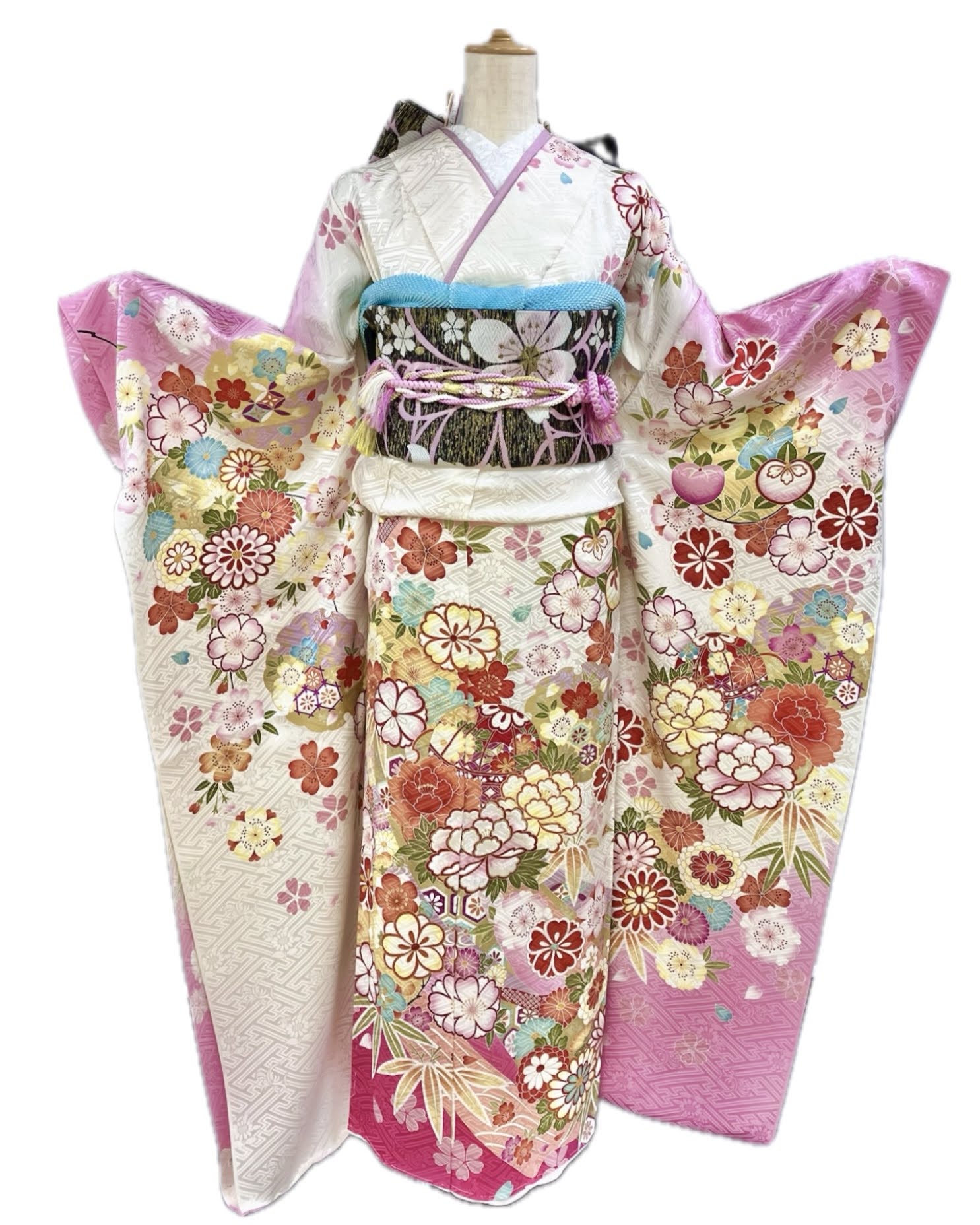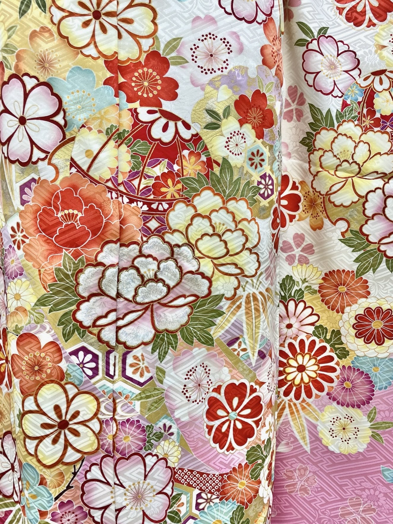 柄は菊や桜、牡丹などお祝いにふさわしい吉祥文様が中心で、伝統的でありながら色使いがやさしく、どこか今っぽい可愛らしさも感じられます。