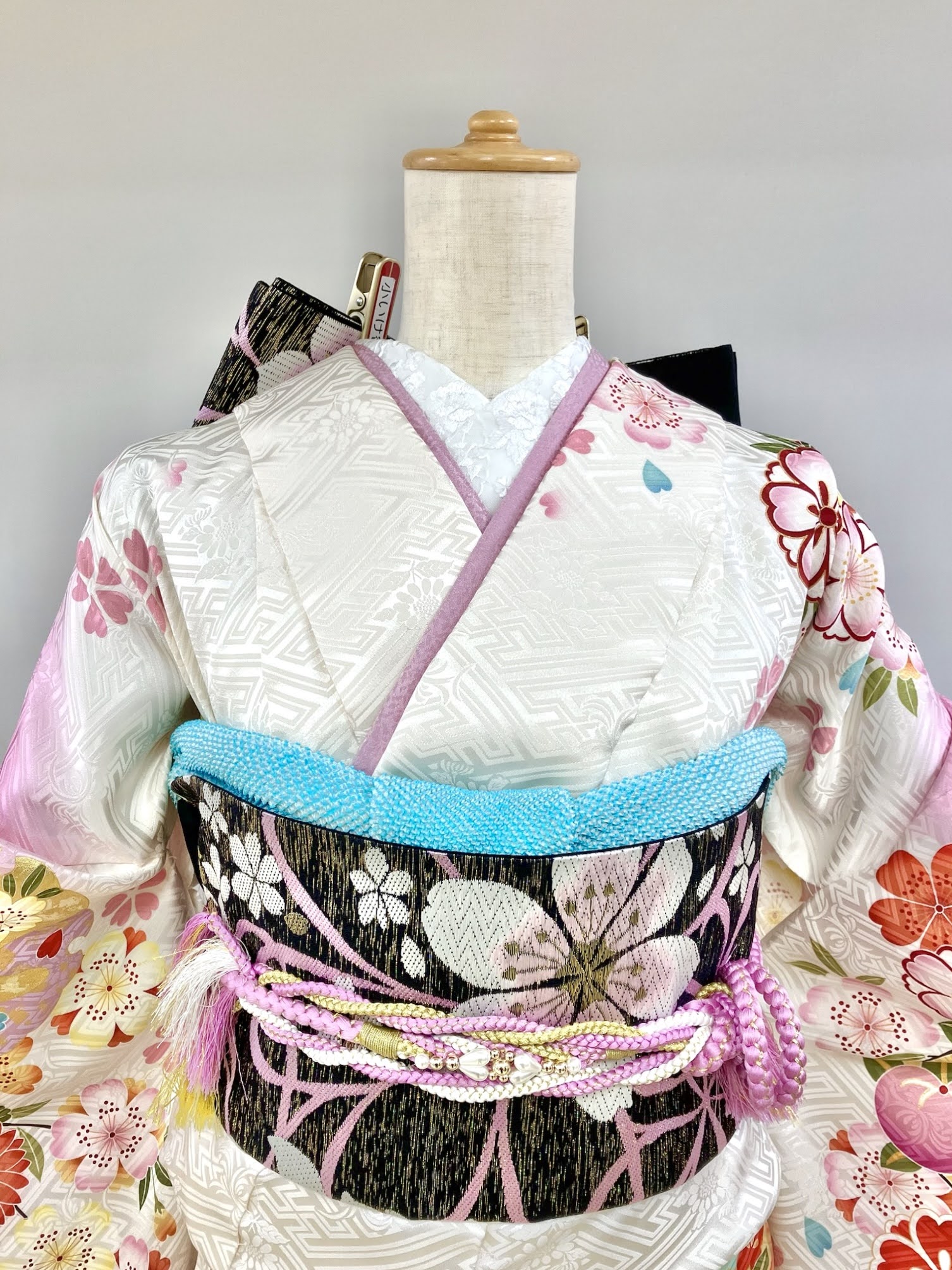 全体は淡くキュートな印象ですが、帯には黒地を合わせることで、甘くなりすぎず全体をきゅっと引き締めました。